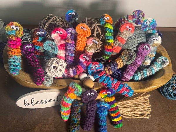Large Bundle of 10 worry worms for $10. Perfect gift for friends, coworkers and family. Hand crocheted perfect fidgets for young and old. Can be used for anxiety or any other reason you can think of. Are available in any color imaginable and many are multicolored. Wonderful for tactile stimulation anxiety reducing.