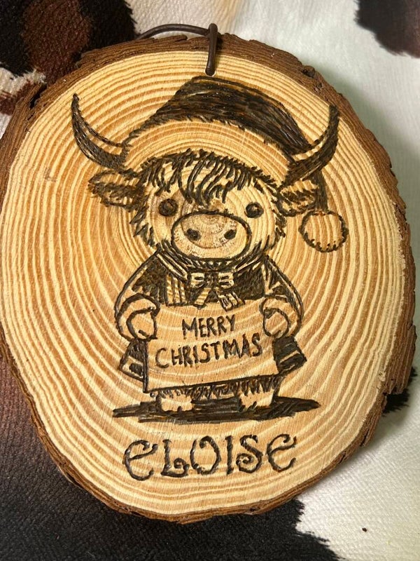 Personalize your ornament for one you love. Each ornament is hand wood burned on a natural wood disc. With the leather cord to hang it it is perfect for your family or country Christmas Decor. Great Gifts for family Friends or Coworkers. Bundle options are available also.